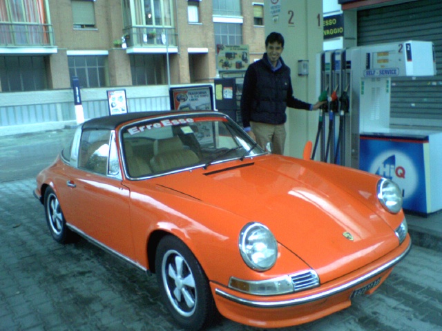 bello il tangerine!  senti ma ha messo le piastrelle sul vialetto così si diverte a far traversi? eheh...no è un condominio nuovo dietro al suo ufficio dove il padre ha preso alcuni garage per i suoi dipendenti...siccome son grandi ci tiene dentro, in fondo, le auto d'epoca  Non riesco a leggere bene la targhetta e non sono sicuro per i modelli di quegli anni: è una 911 E o una 911 S? Non mi pare che la E avesse già i Fuchs  è una 911 E targa...purtroppo quando l'han presa era stata un po' taroccata dal precedente proprietario...alcune cose le han eliminate (fendinebbia improbabili e altro), cmq la macchina è in condizioni stupende, anche dentro! poi andarci in giro subito dopo la Topolino A ha fatto fare un improvviso balzo nel futuro